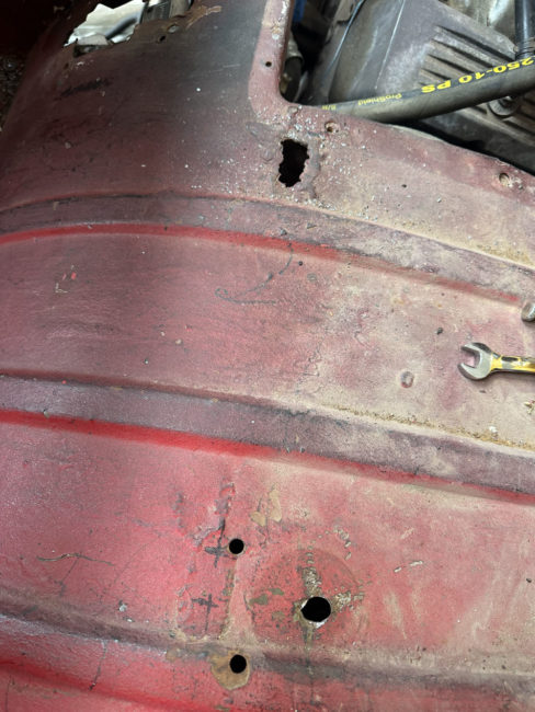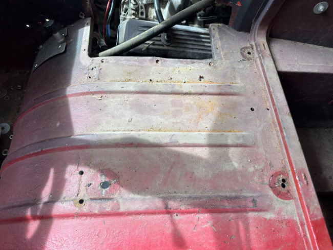 I removed the seat, then pondered the areas where the seat originally mounted. It was immediately clear that the original driver’s side seat mount areas had been patched and welded. My guess is that the area had been fatigued over the years. In addition, a portion of one seat mount bolt remained in it’s original hole, while the other mount area holes had been filled entirely.
