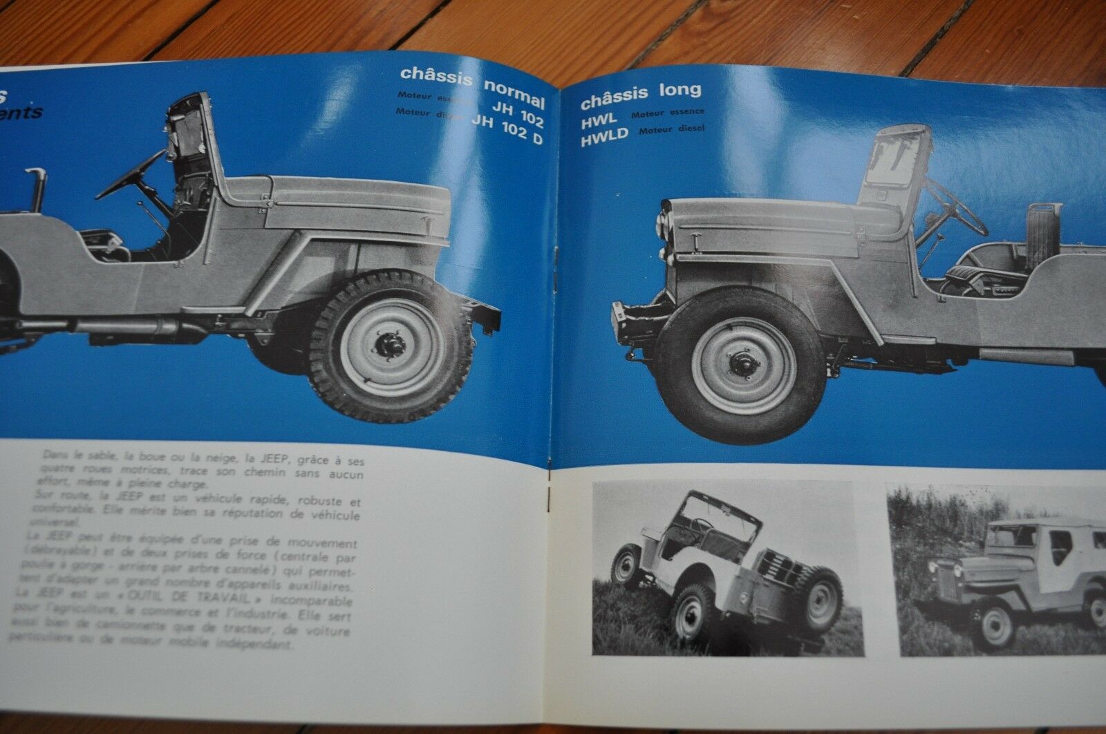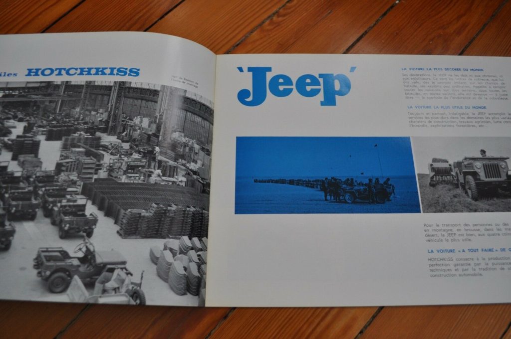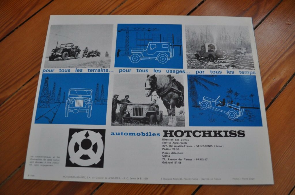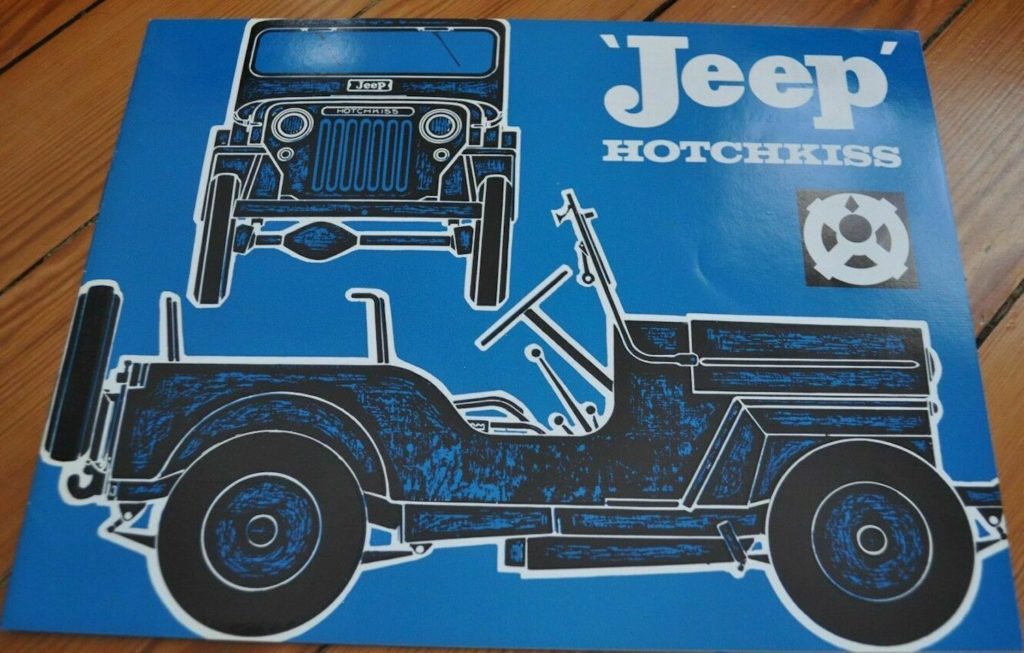 “A rare original Hotchkiss Willys Jeep brochure undated c1950’s with French text. Brochure is very small format 4pp fold out illus in line drawings, no photos and is in very good condition.”