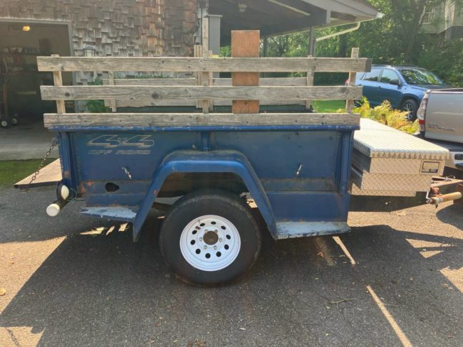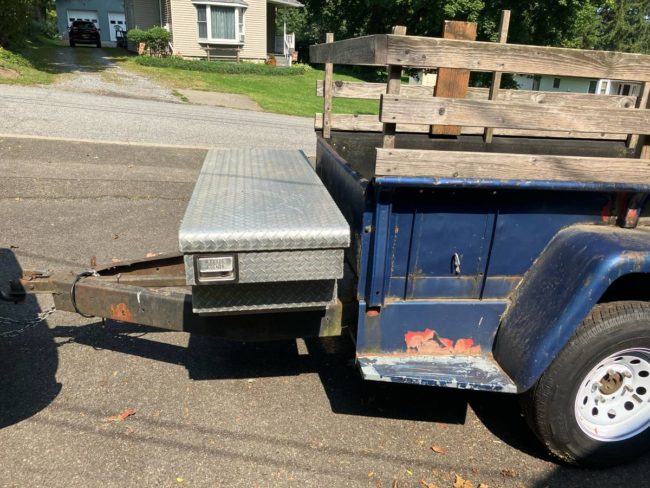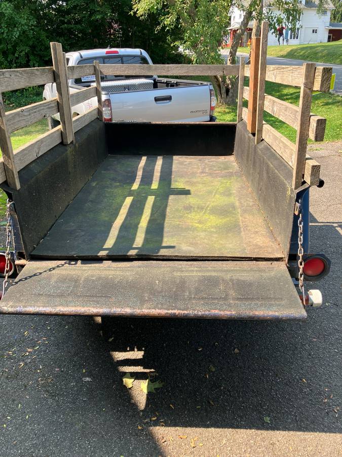 “Home built trailer utilizing Jeep pickup bed and a rear truck axel. Lights work. No brakes. Racks are removable. Comes with tool box. Jack mounted on tongue. Tires new spring 2024. For another hundred I gotta spare you can have. I hauled this trailer loaded from Oregon in April. It pulls great with my Tacoma. Figuring out how to license it in NYS is beyond me. Never occurred to me it would need a plate.