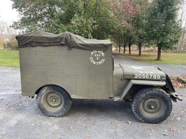 “This is my dad’s 1947 Willy’s CJ2A. He put an original military grill on it, bolted on simulated body armor, and installed military wheels and a pedestal mount for a completely fake, but very realistic all steel 1917 machine gun model (not included unless you buy the 1917 also). He used this jeep for WW2 reenactments, mainly in the 1980s and early 1990s. He recently passed and we are selling it. It was last driving in 2018 when it was parked and does not currently run.