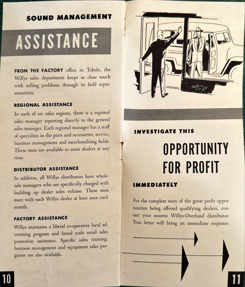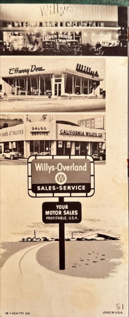 I 2012 I purchased this July 1951 brochure, an 11-page “Your Opportunity to Profit with Willys” (from number FB 1 4CM-751 GG). At that point, I hadn’t bought many brochures before winning it on eBay. Unlike 99% of Willys-Overland brochures, this one was unique, because it targeted potential Willys Dealership owners.