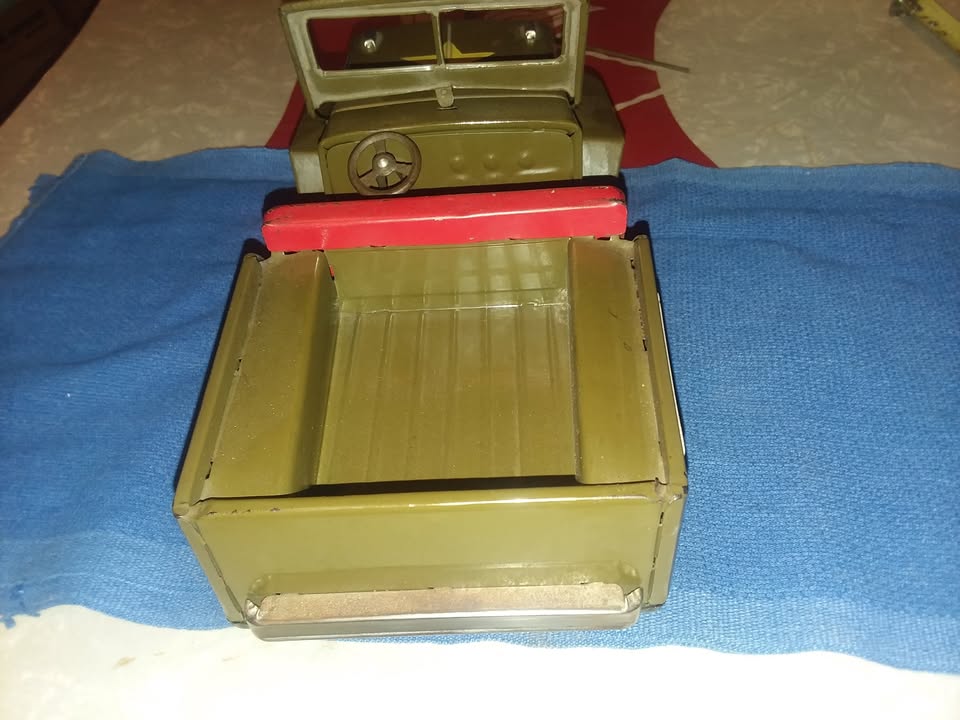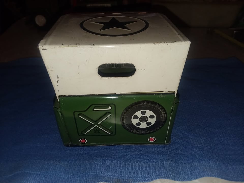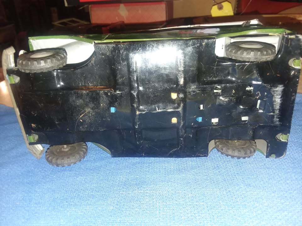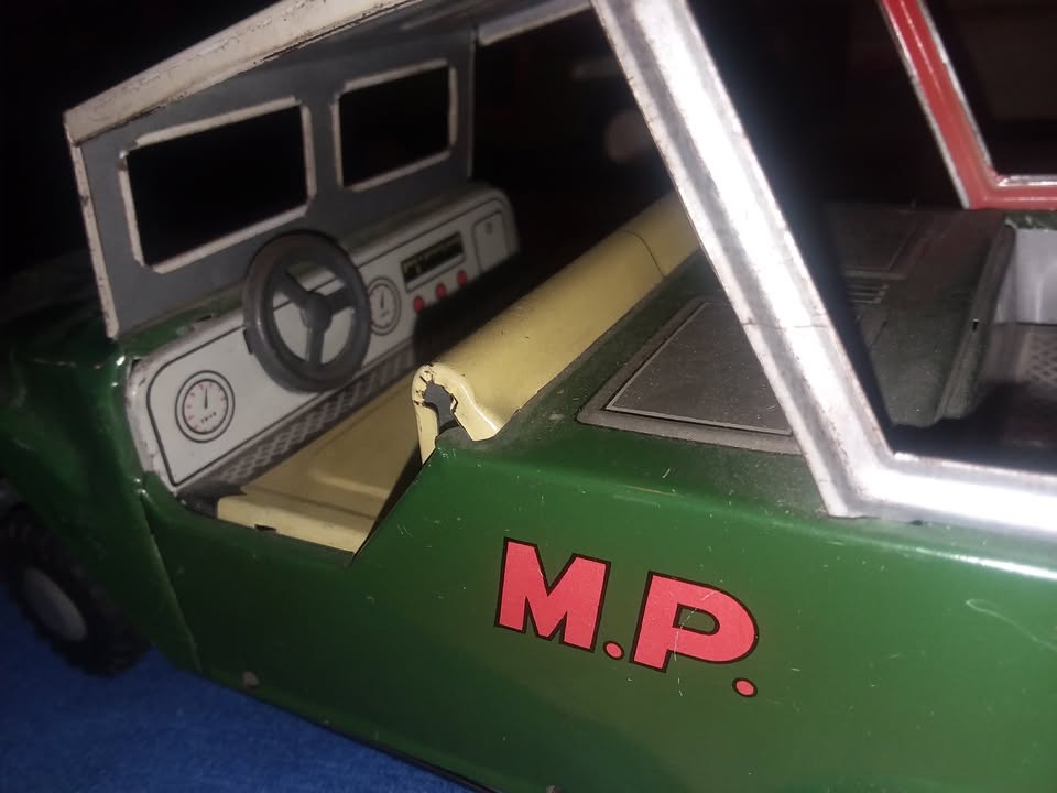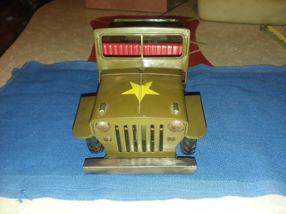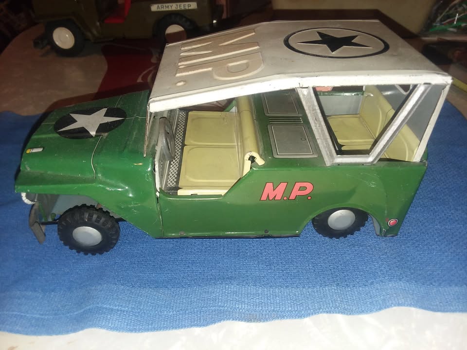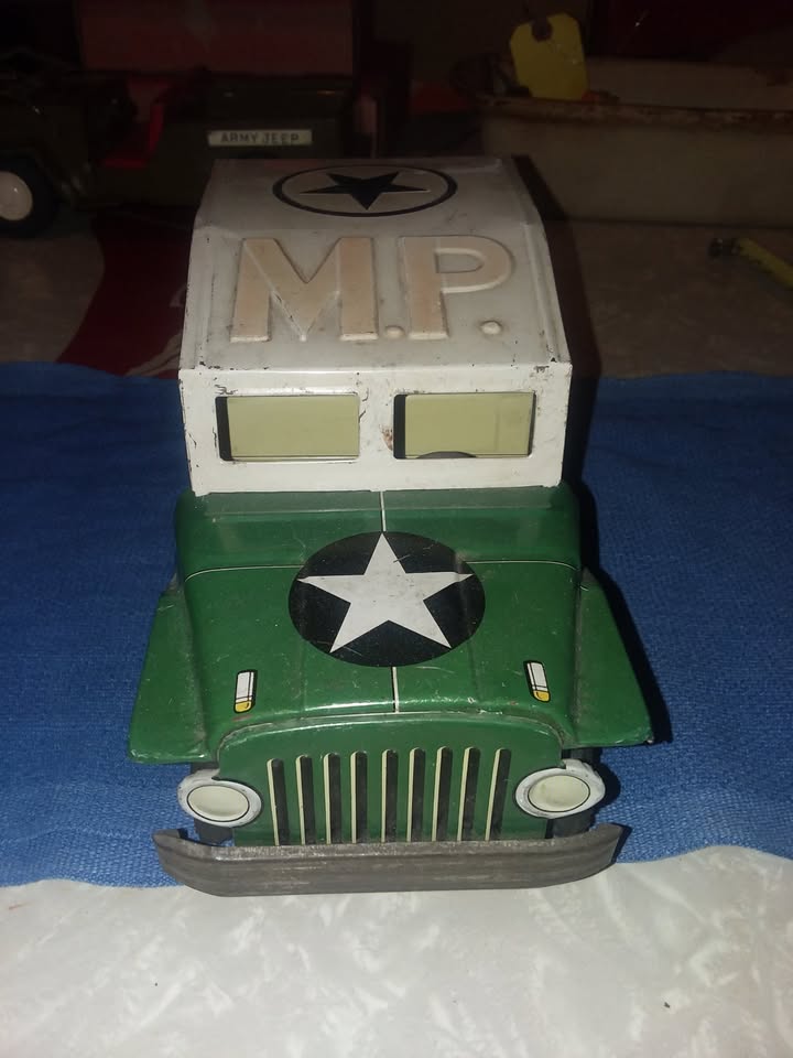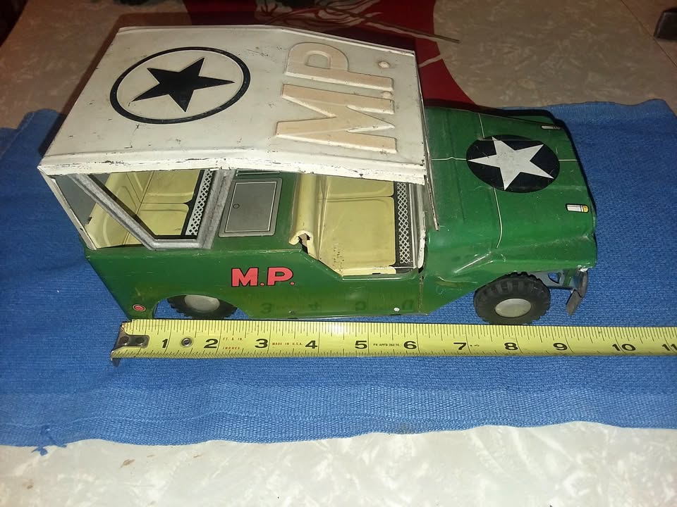 VINTAGE ARMY M.P. JEEP–ABOUT 9 1/2 INCHES LONG– HAS A FEW NICKS AND SCRATCHES–BOTTOM FRAME [DENTS] NEEDS SOME TLC–FRICTION WORKS–RUBBER TIRES–GOOD OVER ALL CONDITION.