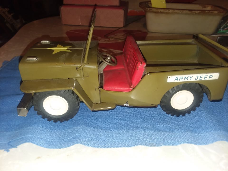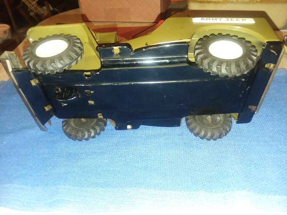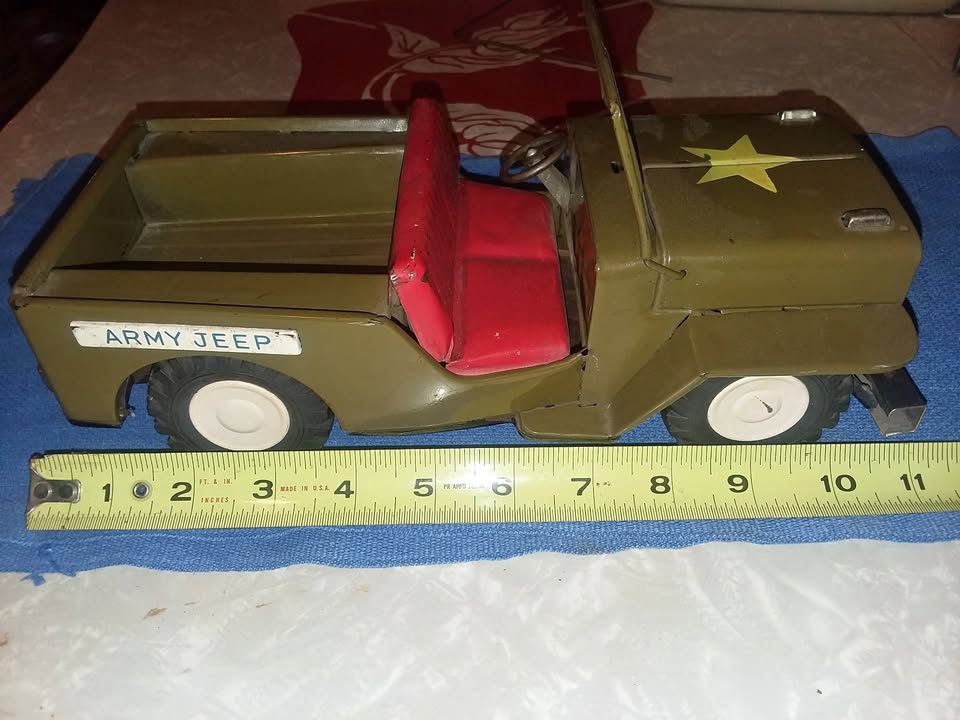 NICE US ARMY JEEP. ABOUT 11 INCHES LONG–FOLDING WINDSHEILD–STEERING WHEEL PRESENT–GOOD PAINT AND DECALE. RUBBER TIRES–SHIPPING AVAILABLE AFTER RECEIPT OF POSTAL MONEY ORDER.
