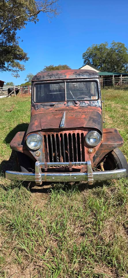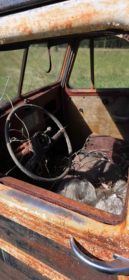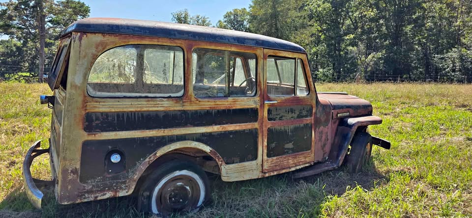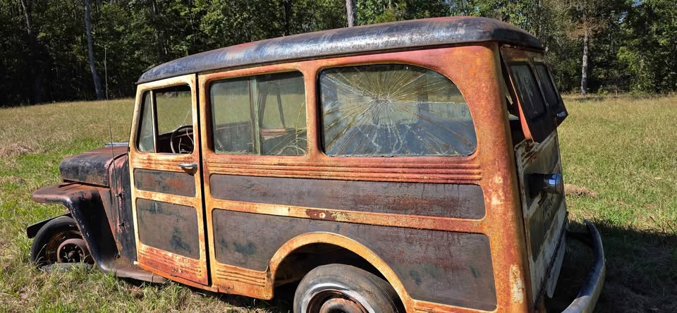 | Listed 20 Weeks Ago, so not sure if available. But this looks earlier then ’49, another fixed vent window, has the Willys Overland script out back. Another early Wagon from what I see, ’47 is my guess. 1/3 of the overridder is there. Single tail light. Really cool rig. |