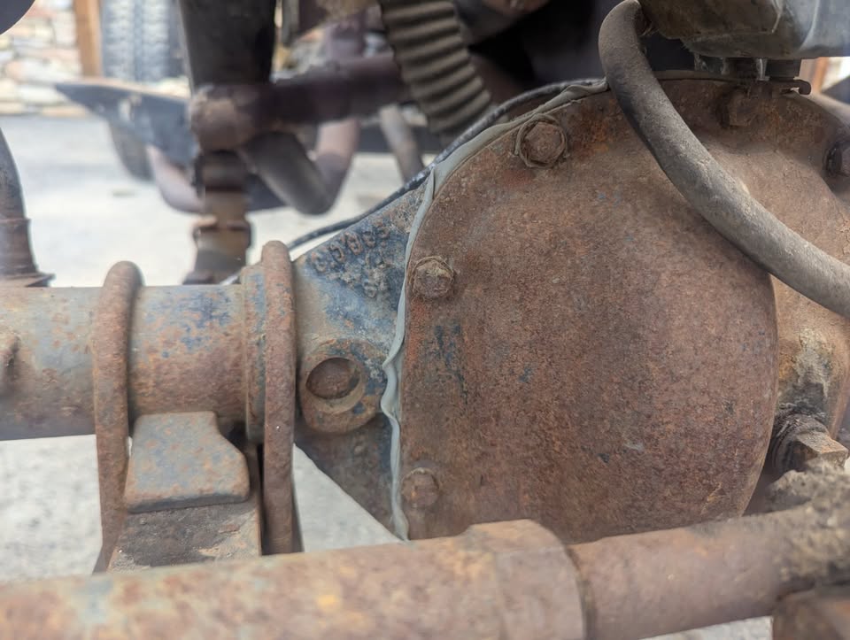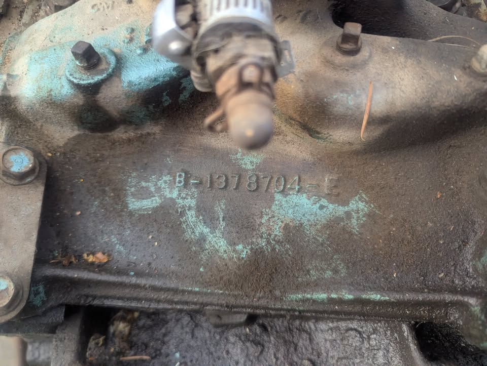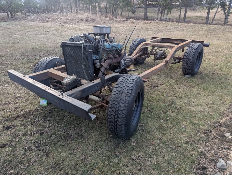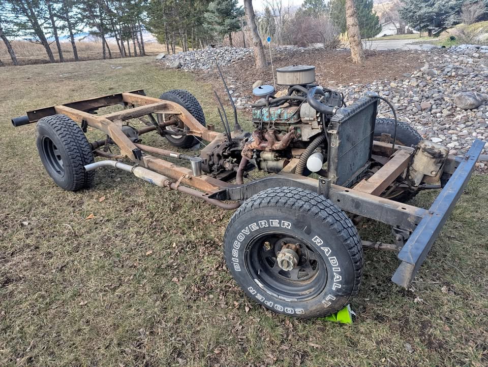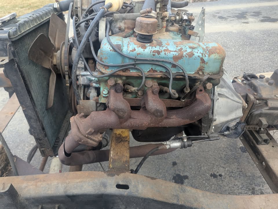 1968 Dauntless 225 odd fire engine, Borg Warner T-14 3 speed and Dana 18 twin stick.  Frame and axles are from a 1964 Scout 80.  4.27 gearing.  Everything works, just drove it into the shop when I removed the body.  Hook up 12v and pour gas in it and it will run.  This is one of the greatest engines ever built.  Runs well, but I can hear the start of a rod knock when it is under load.  Transmission, transfer case and lockouts all work.  Trans does NOT pop out of second gear.  Tires are better than rollers. The flywheel was resurfaced, new throwout  and pressure plate.  I think it might have new wheel cylinders all around as well.