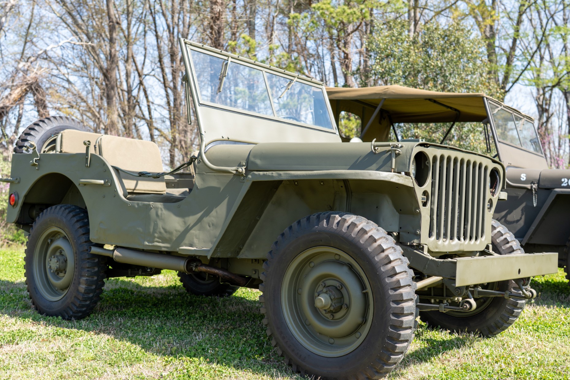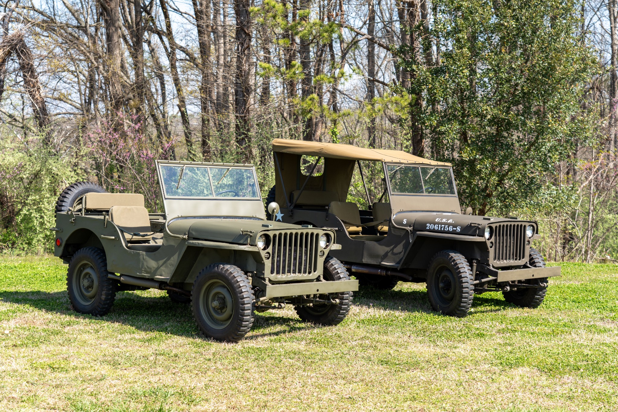 These two consecutive-serial-number 1942 Ford GPWs, chassis 712 and 713, are very early production (VEP) examples that are said to be among the approximately 2,000 built with Willys-style frames. The seller acquired the pair in 1997. Both trucks are finished in olive drab over matching canvas upholstery, and power for each is provided by a replacement flathead inline-four paired with a three-speed manual transmission and a dual-range transfer case. They underwent separate refurbishments under current ownership; GPW-713 was restored in the late 1990s, while GPW-712 was refurbished in the early 2020s with metal repairs to the body and frame. Equipment shared between the two includes 16″ steel wheels, folding windshields, Ford-script rear panels, and blackout lighting. These two GPWs are now offered as a pair in Shelby, North Carolina, with replacement windshield glass for GPW-712 and clean North Carolina titles in the seller’s name