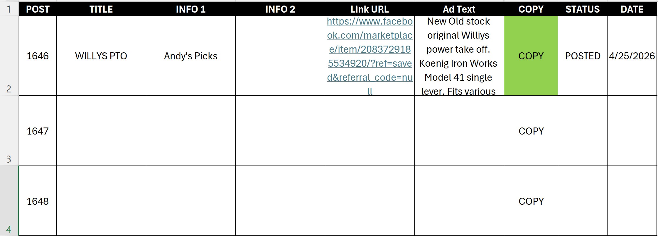 When I double click that COPY cell, that CELL turns Green, it then says POSTED and the date next to that row it then is just pasted into the WP post. It’s all formatted, the Info to seller is buried into the format with a hidden column, the “Link to Ad” is also created.
