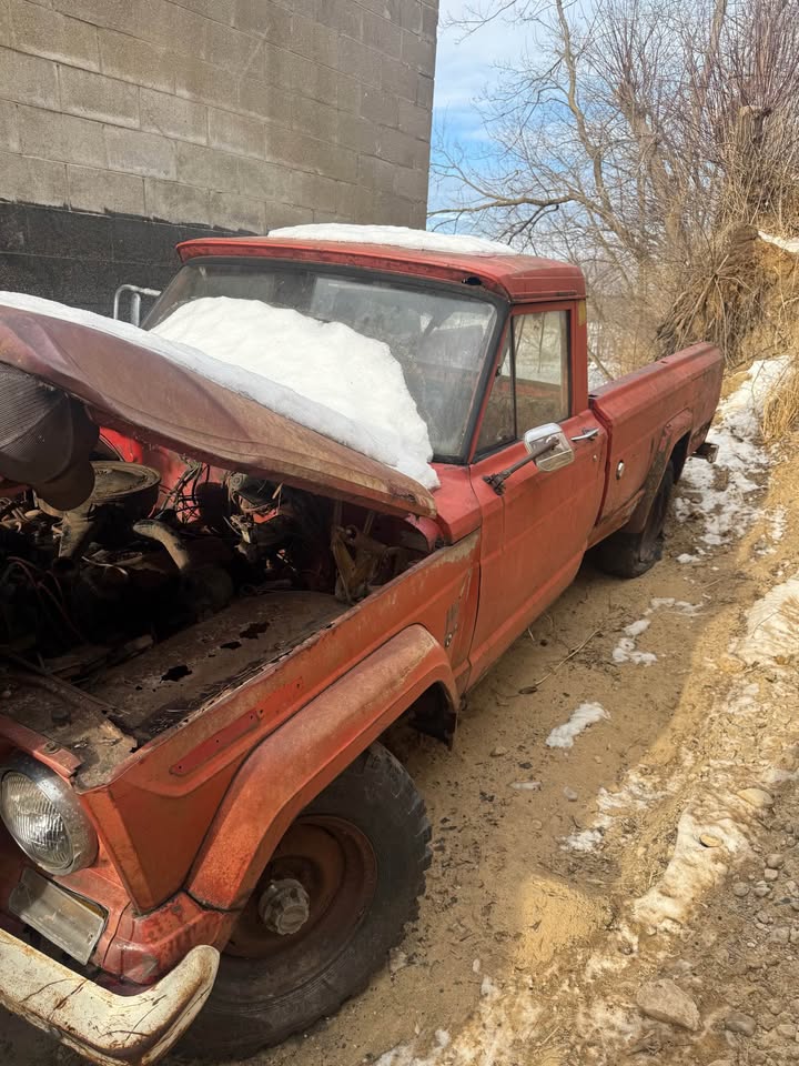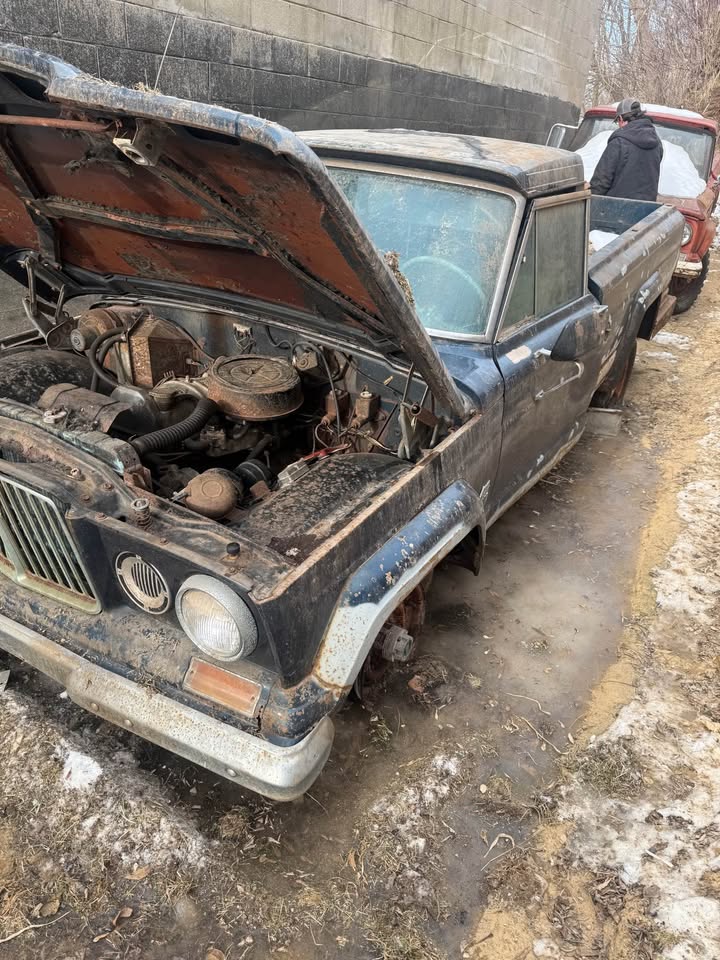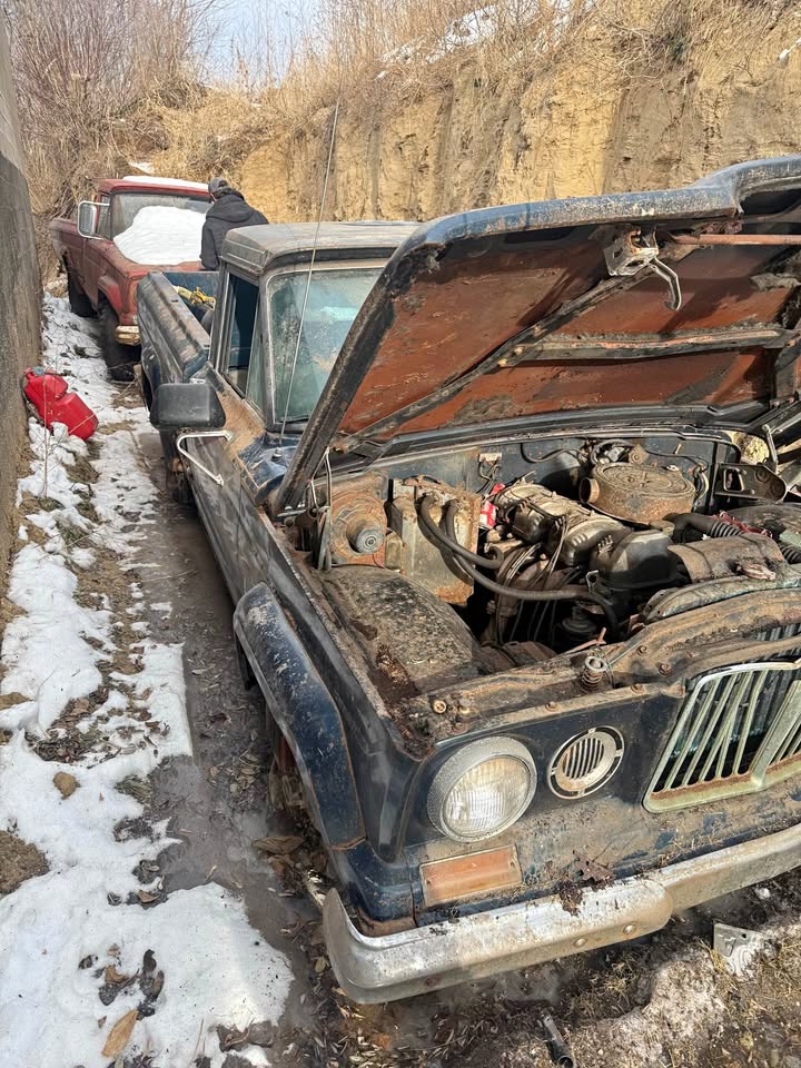 I have a pair of mid 60’s Jeep gladiators. These are major projects or parts cars. Blue one has a straight 6 cab is rough possible frame damage but front clip is nice. Red one is a v8 little more solid but still rough. I am working on getting titles for both. Blue one was a barn find red one was a feild find. I was going to put one together out of the two but I have realized I have an ample amount of projects. Would like to sell as a pair but would separate. Would consider trades for things with motors. Looking for a decent c10 k10 square body roller.