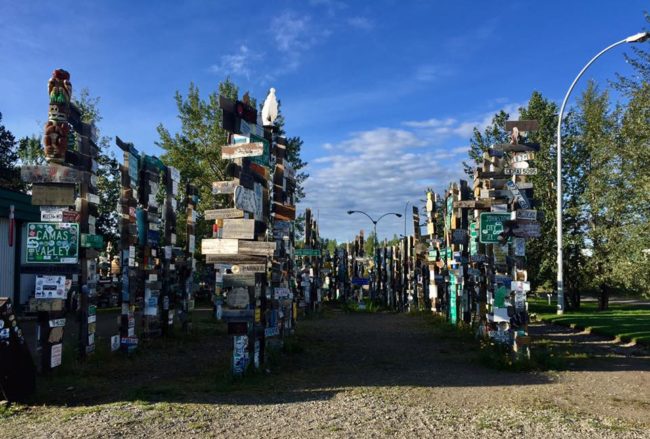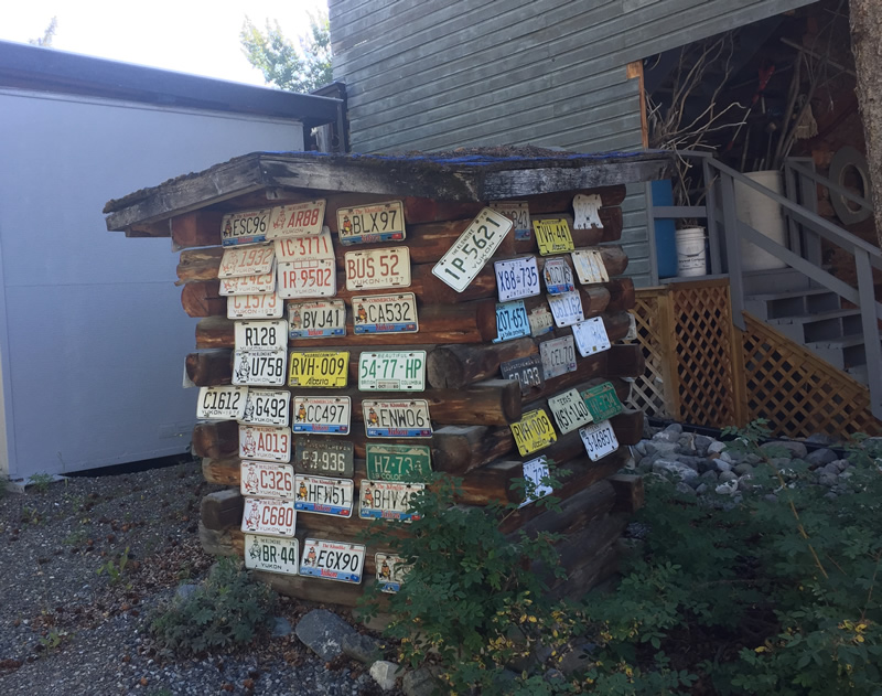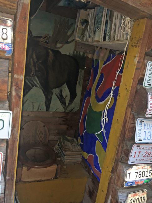 We drove south an hour, then pulled over at Dougie and Bev’s place off of Lake Deese. We’d met them on our way north and they invited us to stop by on the way back. They invited us into their wonderfully eccentric shop, then home. Gold Nuggie Dougie is Doug’s trademark and both are well known around Whitehorse, having owned three hotels at one point (including the one we stayed in). The wonderful couple shared all kinds of interesting stories about their place and Whitehorse and we had a great time with them. Unfortunately, we manage to lose most of our photos from their place!! Here are a few I managed to find. This unique structure is a working outhouse, just behind their shop.