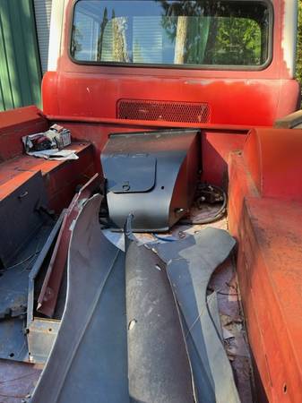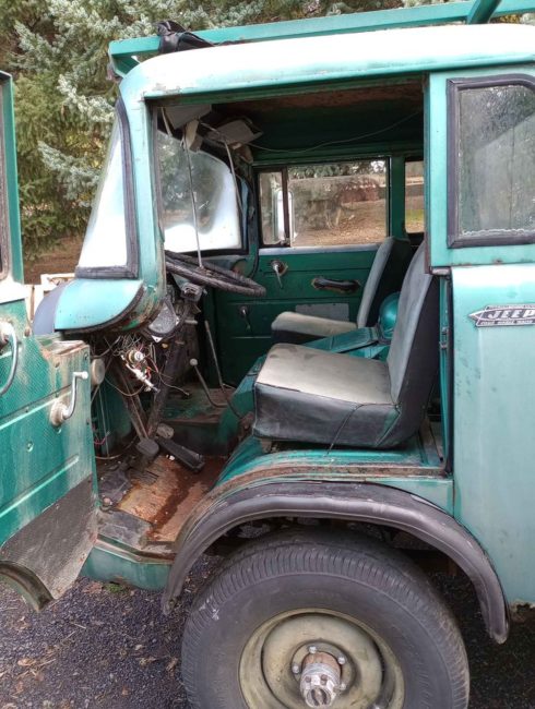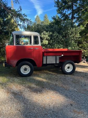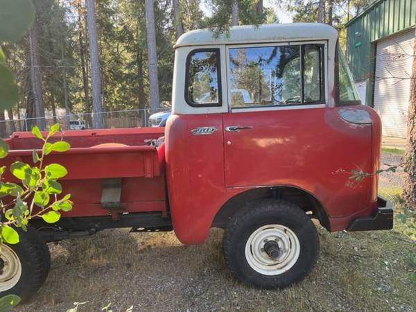 “1963 Jeep FC150. Stock motor runs fine. New aluminum gas tank fabricated in place of rusty original. New clutch disk, pressure plate, Syncros replaced, New brake master cylinder, all wheel cylinders, brake lines, brake drums, wheel bearings, wiring harness, speedo, horn, steering wheel. All new glass, rubber, window track felts, windows roll up and down well. Have but not installed new door cards, plus old upholstered but warped cards. Pretty much all cab rust repair tackled, including replacing steel over the windshield, and at lower corners. At one time it had a snowplow. Main frame plow attachments remain. Other plow brackets and front bumper with snowplow parts except blade included. I have lost interest in completing a cosmetic restoration, but not too much more to go. Located in 95954. Would trailer to deliver as far south as Sacramento, as far north as Redding.”