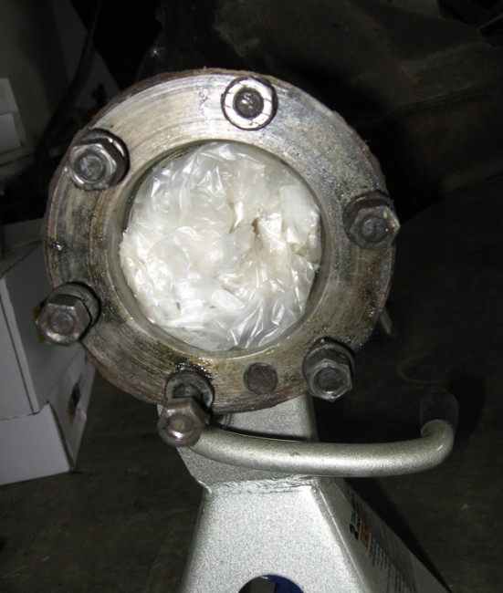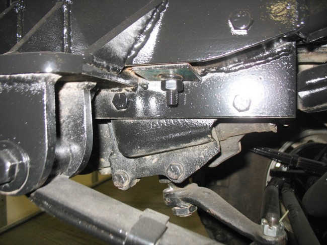 Picture 1 was taken from the driver’s side tire. The frame was plated on the inside with ½ inch steel and protrudes an inch or so below the frame rail. The outside plate is 3/8 and is what the spring mounts are also welded onto (the Scout II axles require outboard spring mounts). 3 of the 4 steering box mount bolt heads are visible; the 4th bolt was welded inside the frame rail because I wasn’t certain if it would interfere with the spring mount if it passed all of the way through. The 2 bottom bolts from the steering box mount to the steering box are also visible; the 3rd bolt is visible in picture 005 on the top-front of the steering box.