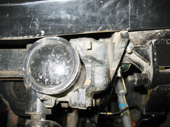 The long bolt that protrudes down through the frame rail is one of the winch plate bolts and the other one you can see in Picture 3 ties the bumper and spring mount together. It is a pretty sturdy assembly with the plated frame rails, spring mounts, steering box mount, winch plate and bumper all tied together. The frame horns had to be cut off to plate the frame rails; the passenger side frame rail was also plated inside and out. This mount allows the steering arm to pass underneath the stock round crossmember and it works well with aftermarket motor mounts.”