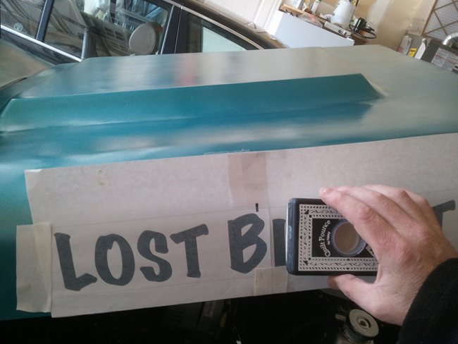 5. Yesterday, with the weather a little warmer, it was time to paint the name. I got out my template, my paint, and my pouncing supplies. I taped the template to the hood and prepared to pounce.