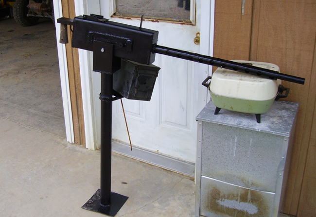 Shep writes, “Just wanted to show you some pics of the dummy gun I made a couple days ago. This dummy gun for the most part is based on the browning M37; which was actually put on tanks instead of Jeeps in Korea. But I thought it was one of the coolest looking of the Browning .30 cals so decided to use its specifications. For the main box of the gun, I used an old piece of 1/4 inch 3×5 tubing, which I found was a mistake because almost all other pieces I welded too it was close to 1/8 inch, thus the voltage on the welder had to turned way up to penetrate the box. The barrel shield was the hardest part. I had to measure all of the distances correct, and I couldn’t start drilling with 13/16″ bit, I had to work my way up. The handle on the back is an old axe hand I cut down and threaded. The bolt shucks back and forth and the sights flip up and down. The gun pivots up and down as well as side to side. The pedestal has an ammo can bolted to the side for realism. I still need to drill the bolt holes for where it mounts in the back of my Jeep, but overall I think this is gonna look good in the M38A1. The gun also comes off the pedestal, I hope to make an attachable bipod for it in the future. Hopefully I get pulled over because the cop thinks it’s real, that means I did a good job making it!”