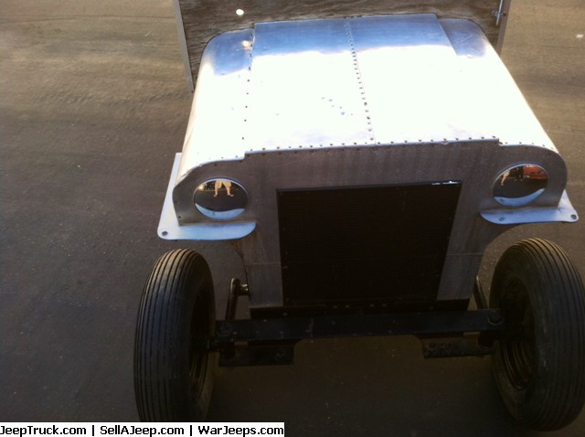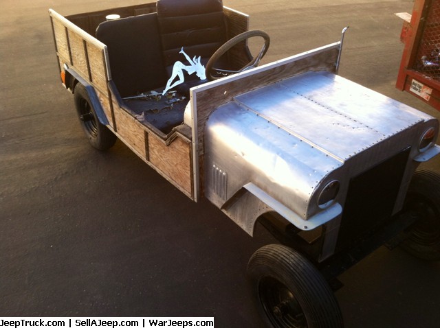 “Homemade wooden 1940’s Jeep/Ford/Willy’s lawn decoration. Built approximately 2 years ago, it is displayed 3 times a year, Memorial day, Veterans day, and the 4th of July, the rest of the time it is garaged. It is approximately 8’L x 4’W x 53″H, it sits on 2 cut to fit trailer axles with 12″ wheels, it is wired with 7 fluorescent lights that are easily accessible, it is wired for 110vac and has an on/off switch and approximately 10′ of plug cord. This is a decoration, it is not powered to move, and has no steering mechanism’s, however, it is more than sturdy enough to support a couple of adults/children for photo’s, which it has been used for a lot. Only serious enquiry’s please, there is a lot of money in this decoration and the price is firm, I am only hoping to free up some space in my garage, I will really hate to see this go.”