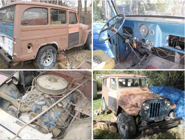 “This is a 1963 Willys Wagon which I got from a guy who was moving to Texas and couldn’t keep it. It was his grandfathers and was a project that he had started working on. The body overall is in good shape with some rust around the rear wheel wells and along the back tailgate which is typical for these. It has a Ford 302 and late model drive train that was put in by the grandson. I don’t know how many miles is on the engine or when it was last run, but is does turn easily. Nice big bumpers on front and back. It does have boxes of extra parts, one original seat and 4 late model bucket seats, an extra tranny, a spare wheel/tire that looks brand new, extra lights, plenty of chrome pieces and trim parts and lots of misc. Also 2 extra front fenders. Brake system does not work at this time and steering is backwards. Overall it is a project vehicle but would be really sweet and unique once driving down the road. See pictures and call me with any questions you might have or if you would like to check it out. It does have an existing Title. Thanks, Randy (719) 244-6617. Also I have more pictures I can e-mail you on request. Leave a message and I will call you back as soon as I can. I have just reduced the price to $850 or best offer.”