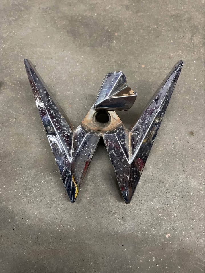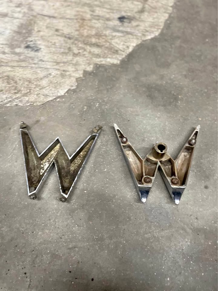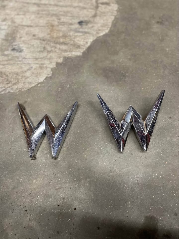 Front and rear 1953 Willys Aero emblems. Both show a fair amount of pitting in the chrome.