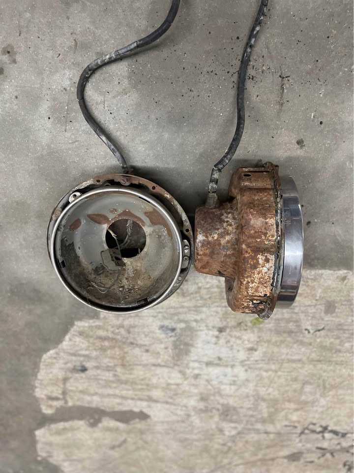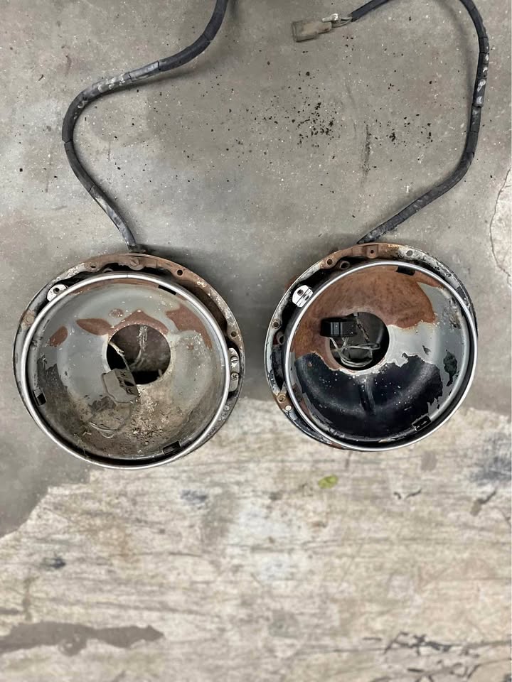 Headlight buckets from a 1953 Willys Aero. The wiring will need redone, but the headlight connectors are there. The chrome trim rings are in good condition.