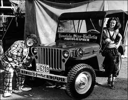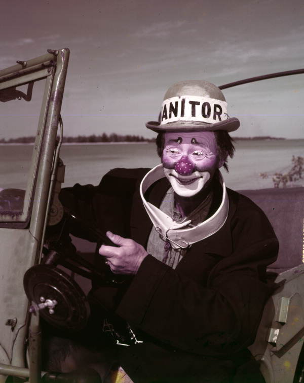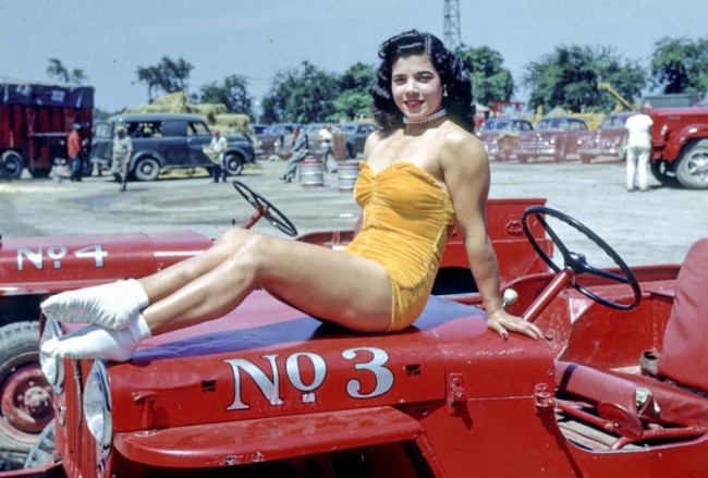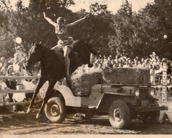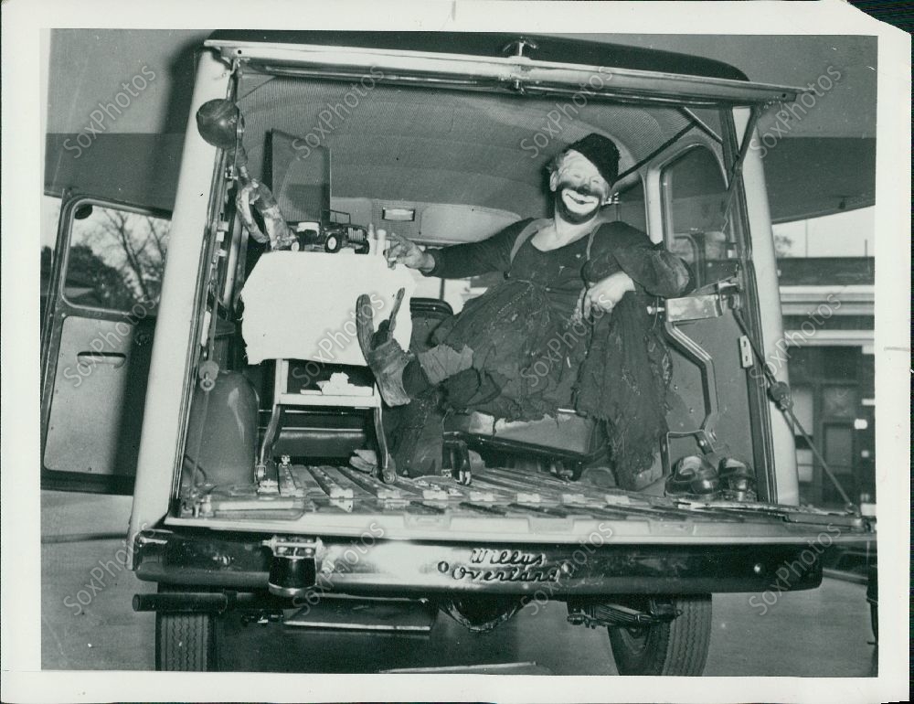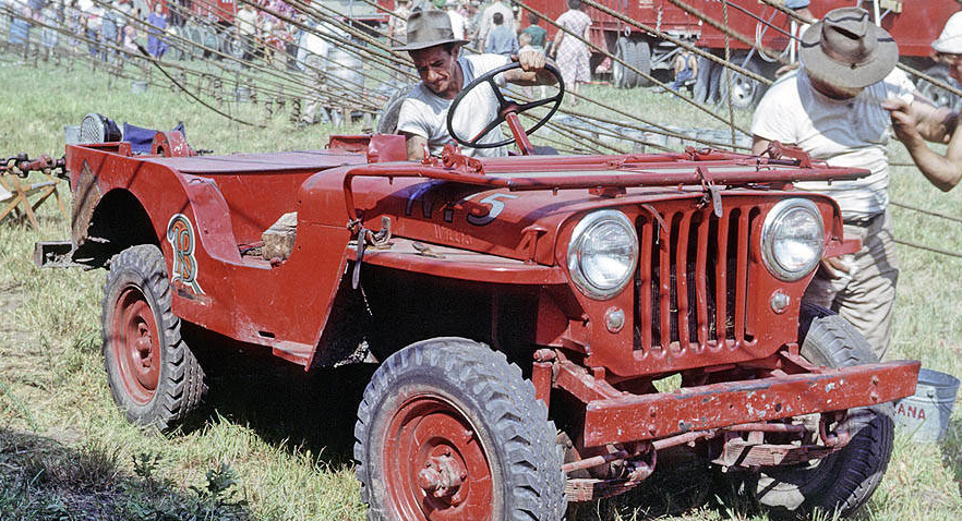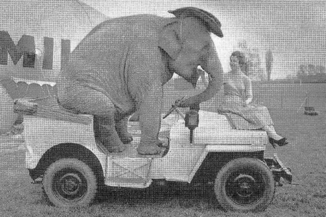 Kam the elephant starred for the Bertram Mills Circus during the 1950s and into the 1960s. Initially, Kam drove a modified MB/GPW. It looks like it had an updated motor. Unfortunately, the only images I have found of Kam on the jeep are from the above poster and from page 240 of “The Jeep” book (a black and white photo which I don’t show). In the photo, as in the poster, there is a hump in the hood, which I assume is the result of the engine swap. The jeep has the usual WWII attributes: tool indents, rear floating hubs and other details. Unlike the poster, the photo shows the fenders were left stock and flat, rather than rounded as shown in the poster.