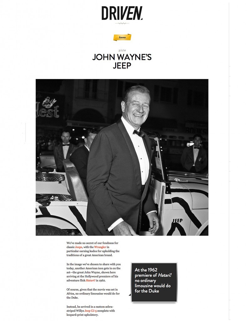 John forwarded this photograph from the March 2012 issue of Driven Magazine that shows John Wayne arriving to the Hollywood premiere of his movie Hatari in a striped CJ-5. There were a few FCs in the Hatari movie, too.