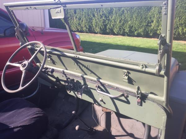 “Im listing my fathers 1949 Willys Cj 3A Jeep. It has front end damage. The impact caused the front bumper to be pushed in which caused the grill to be pushed in towards the engine. This caused the radar to make contact with the fan and it punctured the radiator. The impact also caused the body to shift forward approximately 2 inches bending the front fenders, dashboard and it caused the rear drive shaft pop out of the transfer case . The transfer case and drive shaft are not cracked.