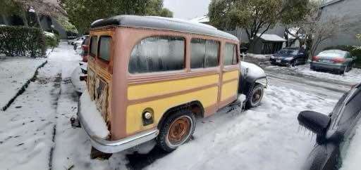 “1951 Willy’s Wagon. All original four cylinder engine! Granny 4 Speed, withnivertide. 4-wheel drive very rare. 3-way ice cream truck with style rear doors. New wiring harness. Runs good. Great surf wagon project with good bones. Firm 7500,”