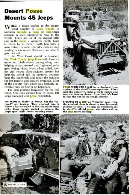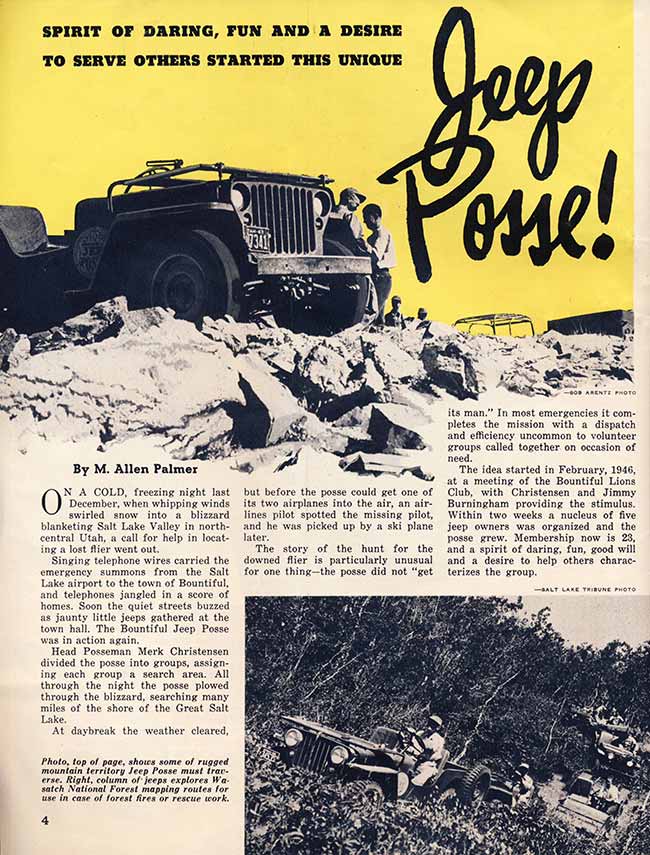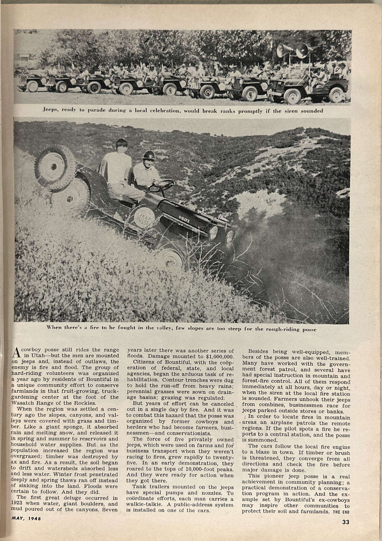 Here’s another story with images about the Bountiful Jeep Posse. This appeared in the May 1948 issue of Outdoor Life. Interestingly, this article summarizes the environmental history and purpose behind the creation of the Bountiful Jeep Posse.