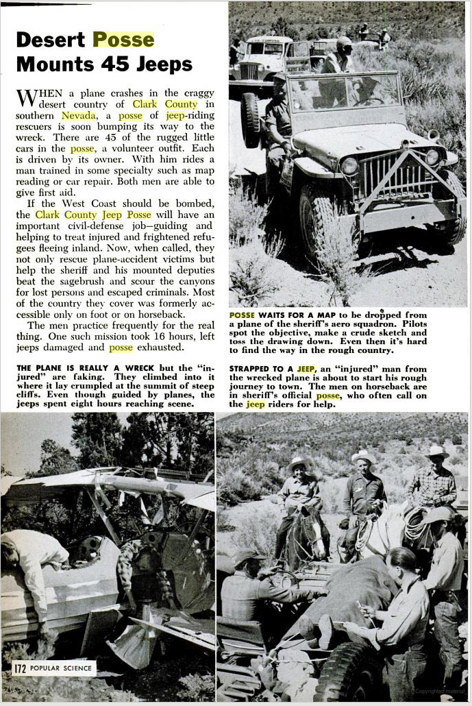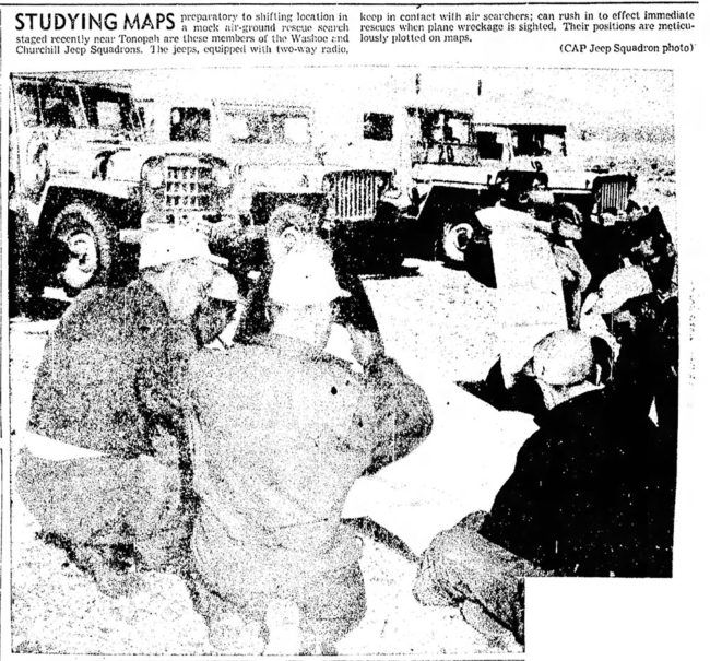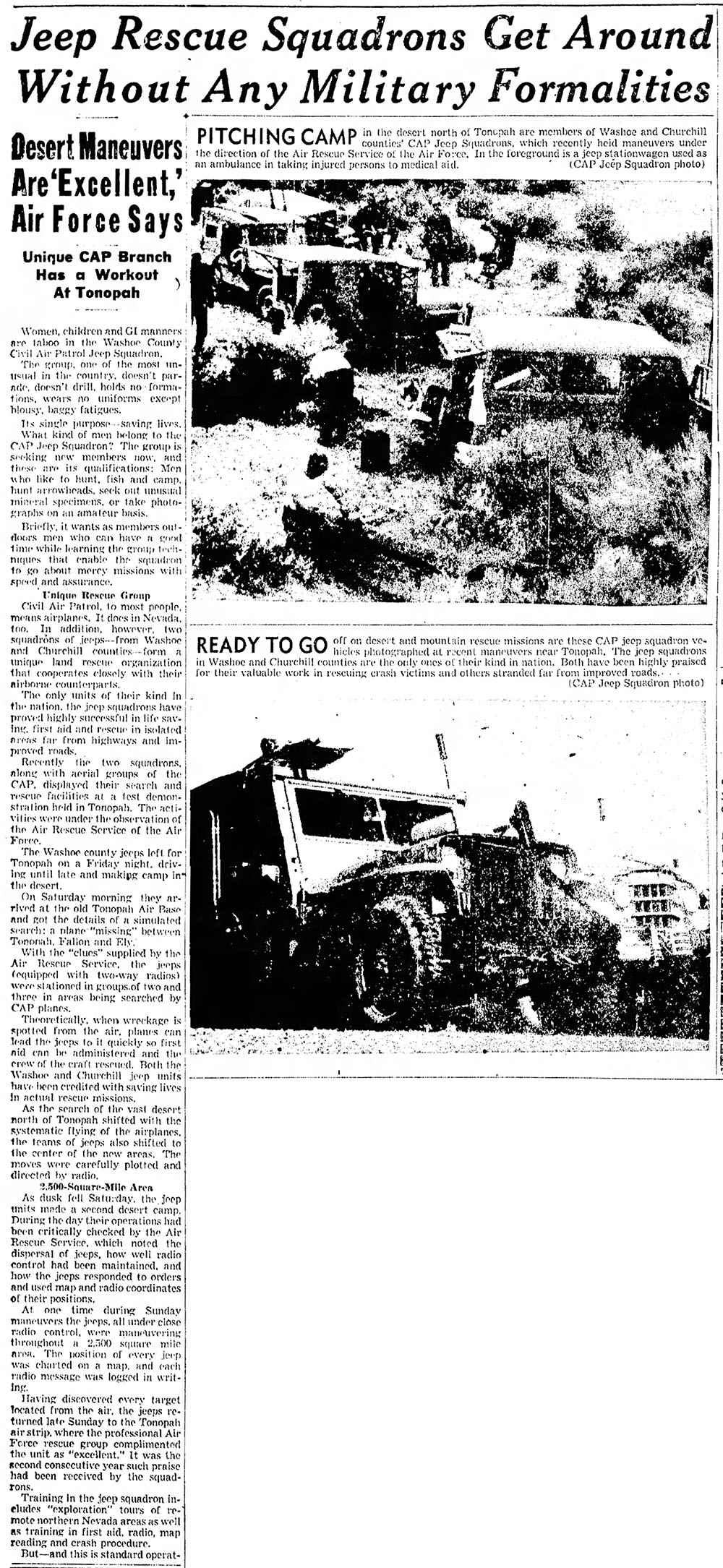 The May 30, 1954, issue of the Nevada State Journal reported on the practice maneuvers of a squadron of jeepers unique to Nevada that worked with the local Civil Air Patrols on rescues. Nevada had two different squadrons, one in Washoe County and the other in Churchill County.