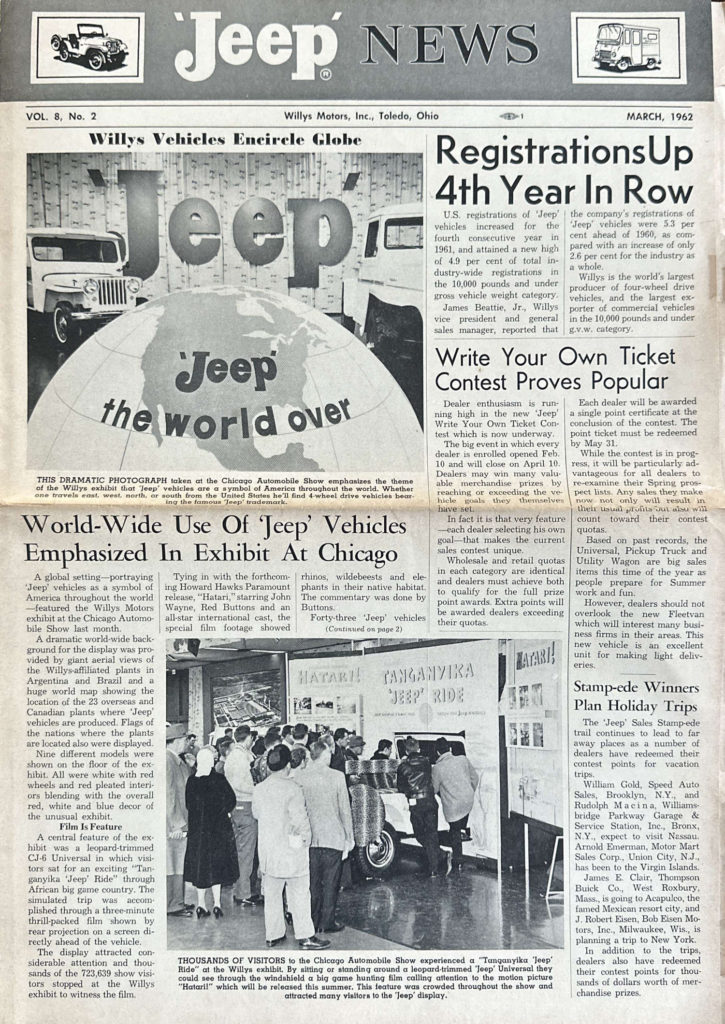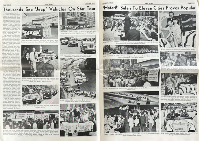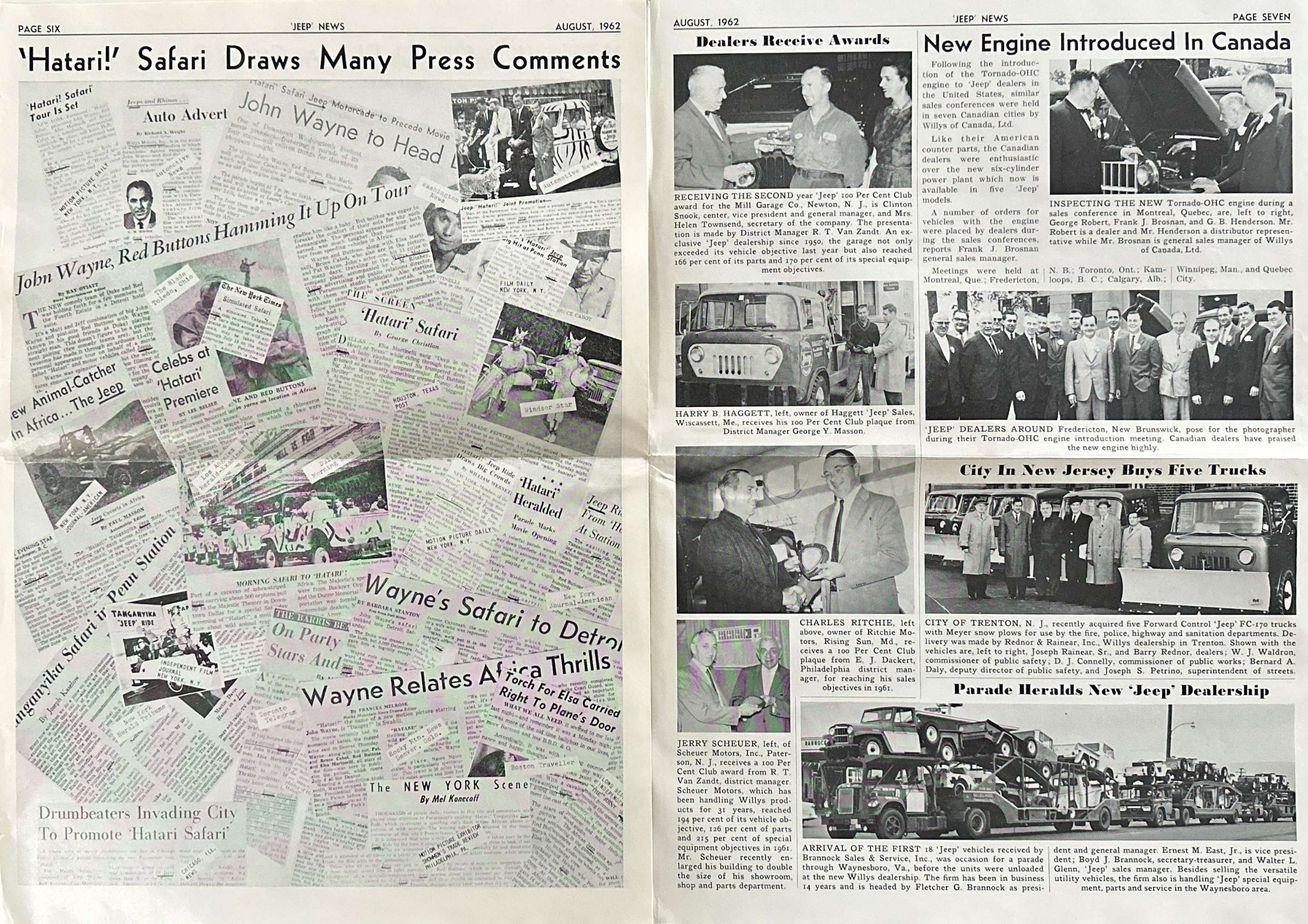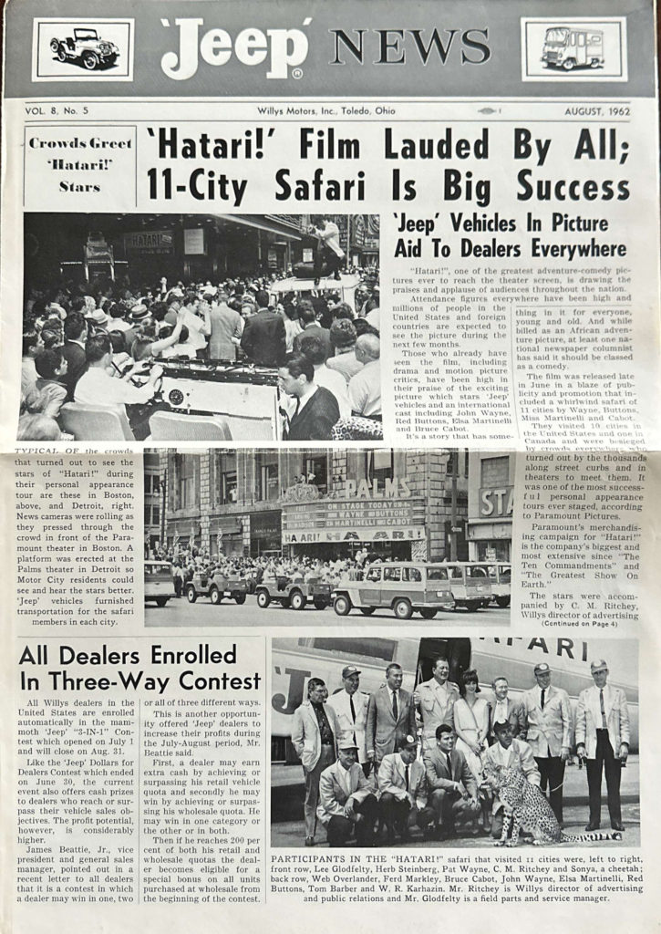 This eight page August 1962 Jeep News Issue leans heavily Hatari. Pages one, four, five and six all focus on Hatari-related images and stories.
