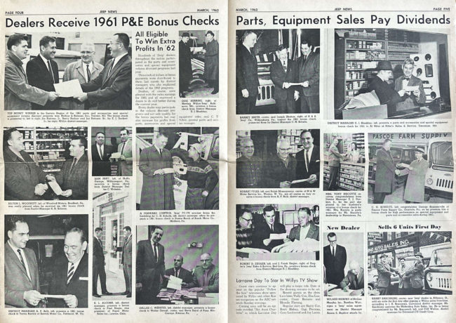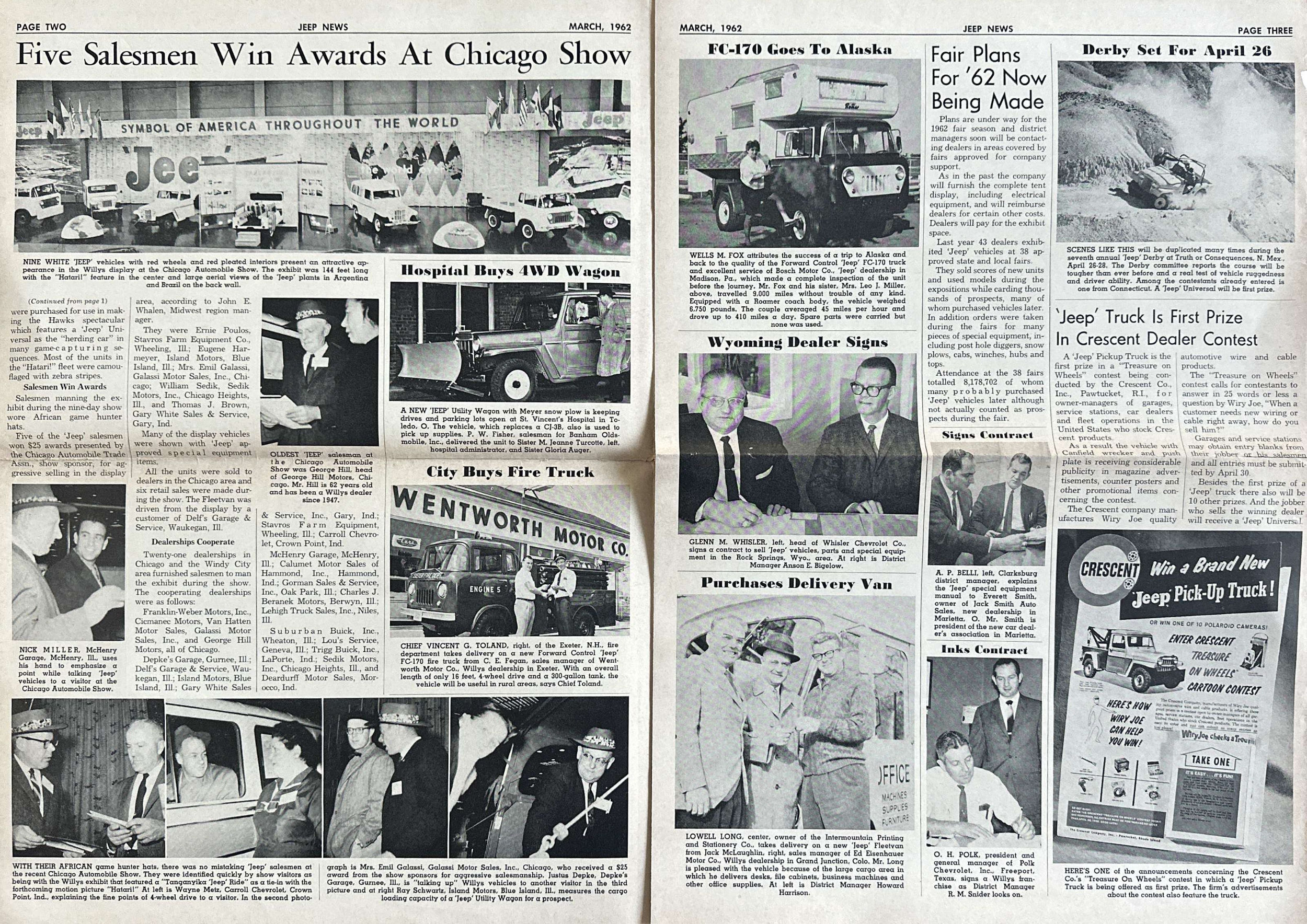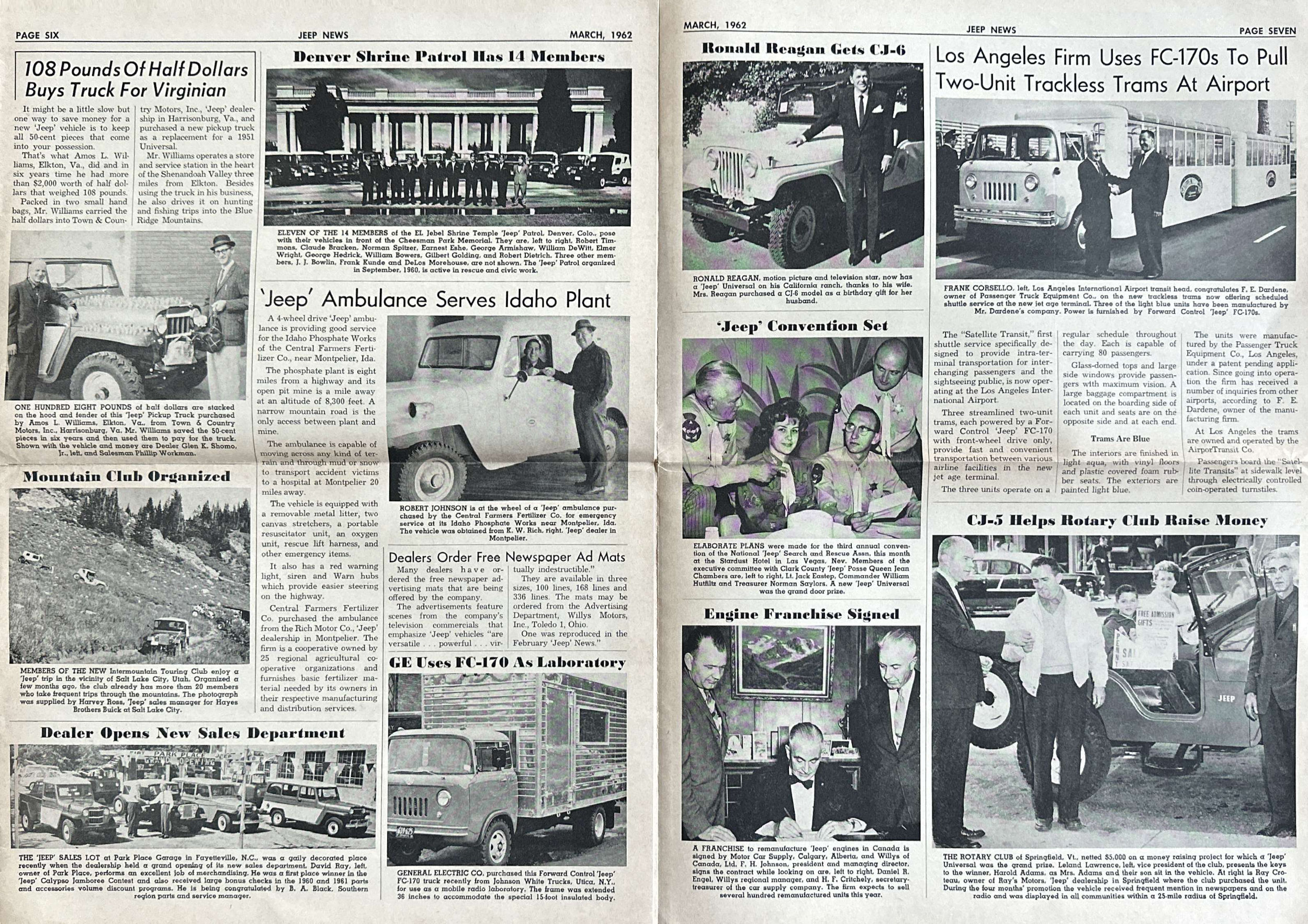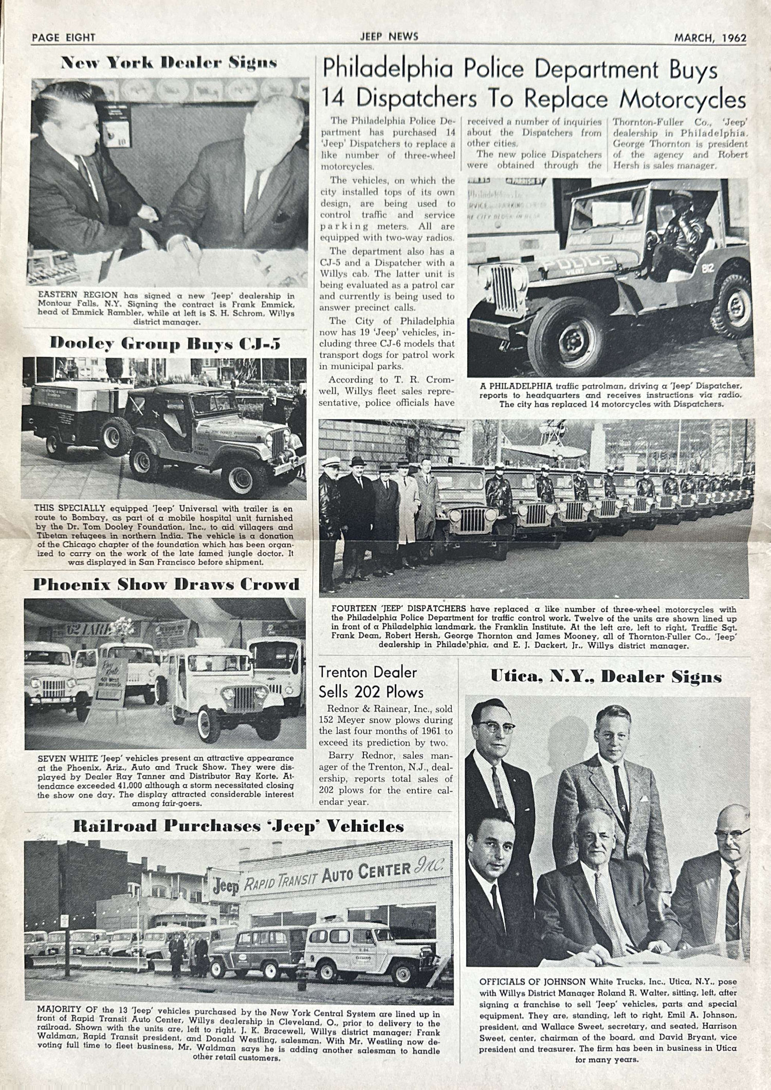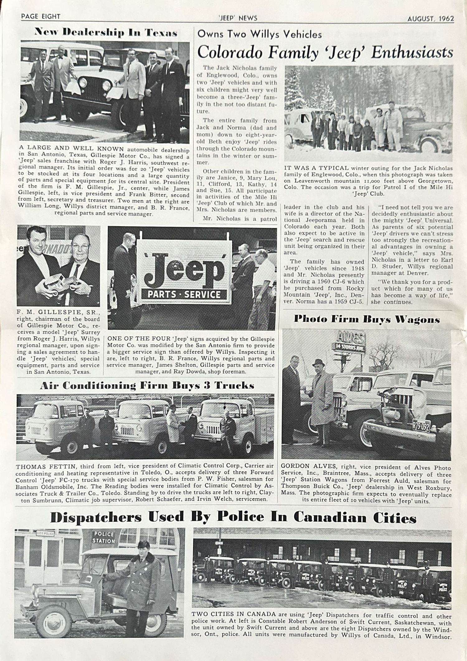 Page two notes that the Post Office order for FJ-3s had grown to 7,082 multi-stop vans, of which almost 6,000 were already operating in over 600 cities. Pages three, seven, and eight offer a potpourri of jeep-related images and captions.