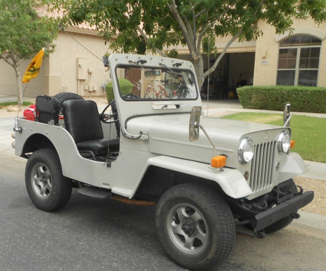 “1977 Jeep Mitsubishi, in original condition and excellent shape. The top is immaculate, the interior in excellent shape and no rust, dents, or scratches. The tires are cracked because they are from 1977, they are the OME.