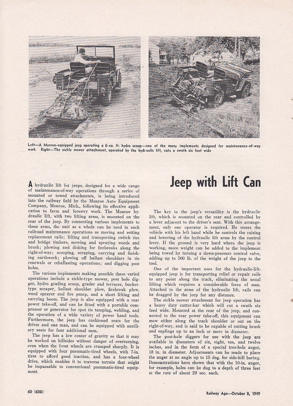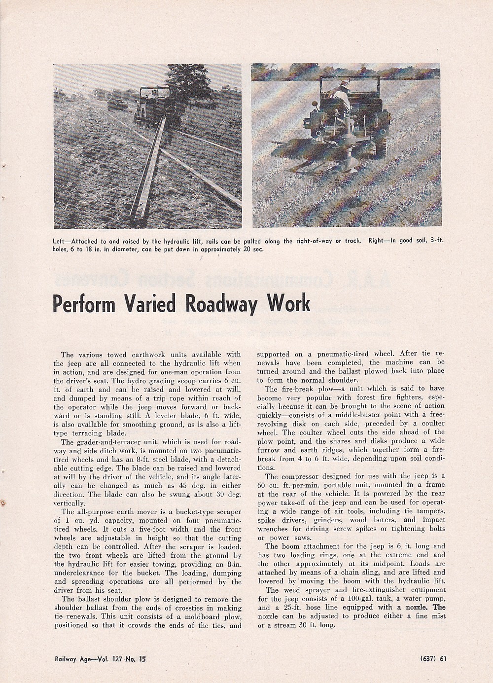 This article for sale on eBay comes from the October 9, 1949, issue of Railway Age. It shows four different pictures of a jeep doing different railroad related tasks.