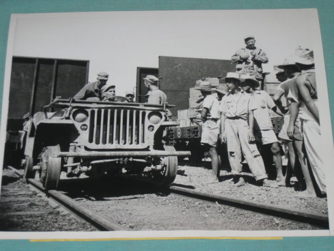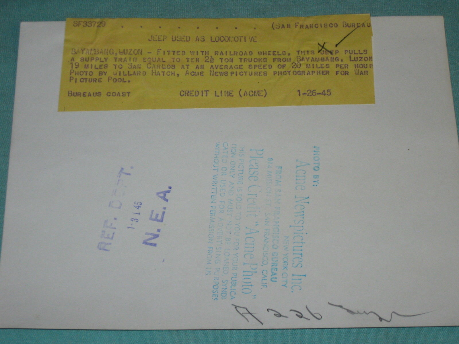 “Original WWII press photo of American GIs using Jeep fitted with railroad wheels as a locomotive to pull supply train on Luzon, Philippines, 1/25/1945.”