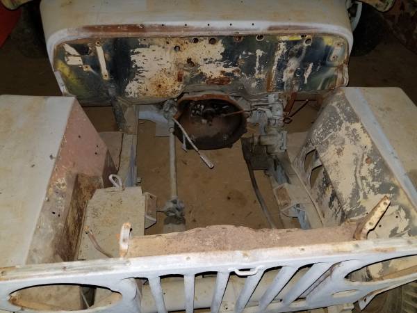 “Very Early Civilian model CJ2A. If this ad is still up it’s still for sale. Ser#18711, ’46 column shift. The frame, drivetrain, and body have been primered. This jeep does not have an engine. The body has had some bad spots cut out and patch panels made. The panels fit great but are not welded in. You can weld in these panels, or buy reproductions and use them depending on how precise of a restoration you want to do. This is a great restoration candidate, still has the column shifter and transmission. I do have other parts available for this project.”